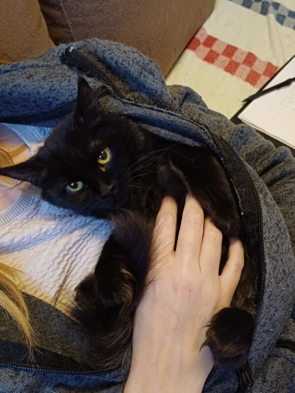 Ballerina kom till oss med flera andra från en större kattkoloni. Hon har därmed varit lite skygg och tyckt att vi människor är lite läskiga, men även om hon låter lite fräsigt så är hon ett riktigt kurrmonster som älskar att gosa så mycket att hon dregglar.