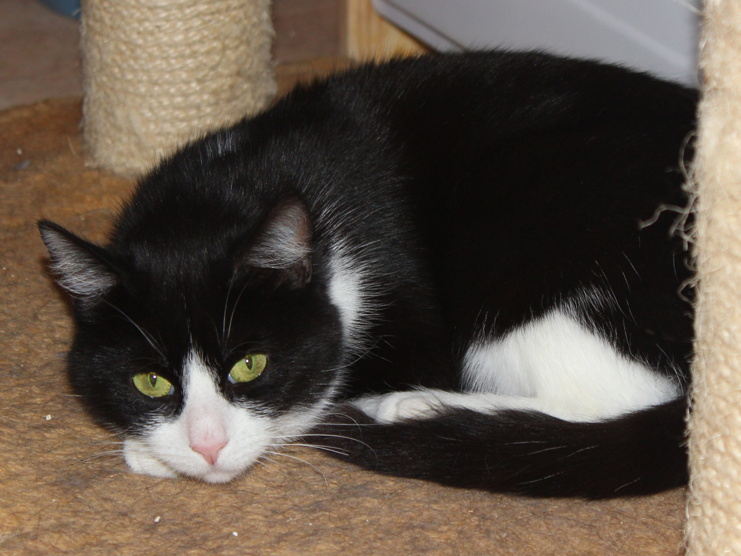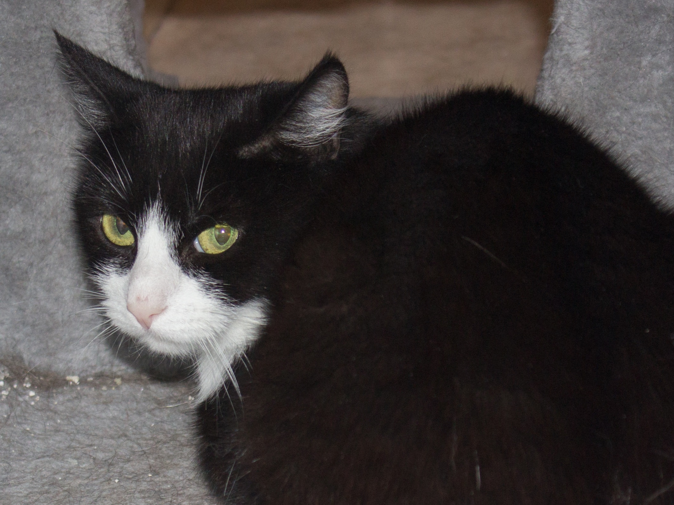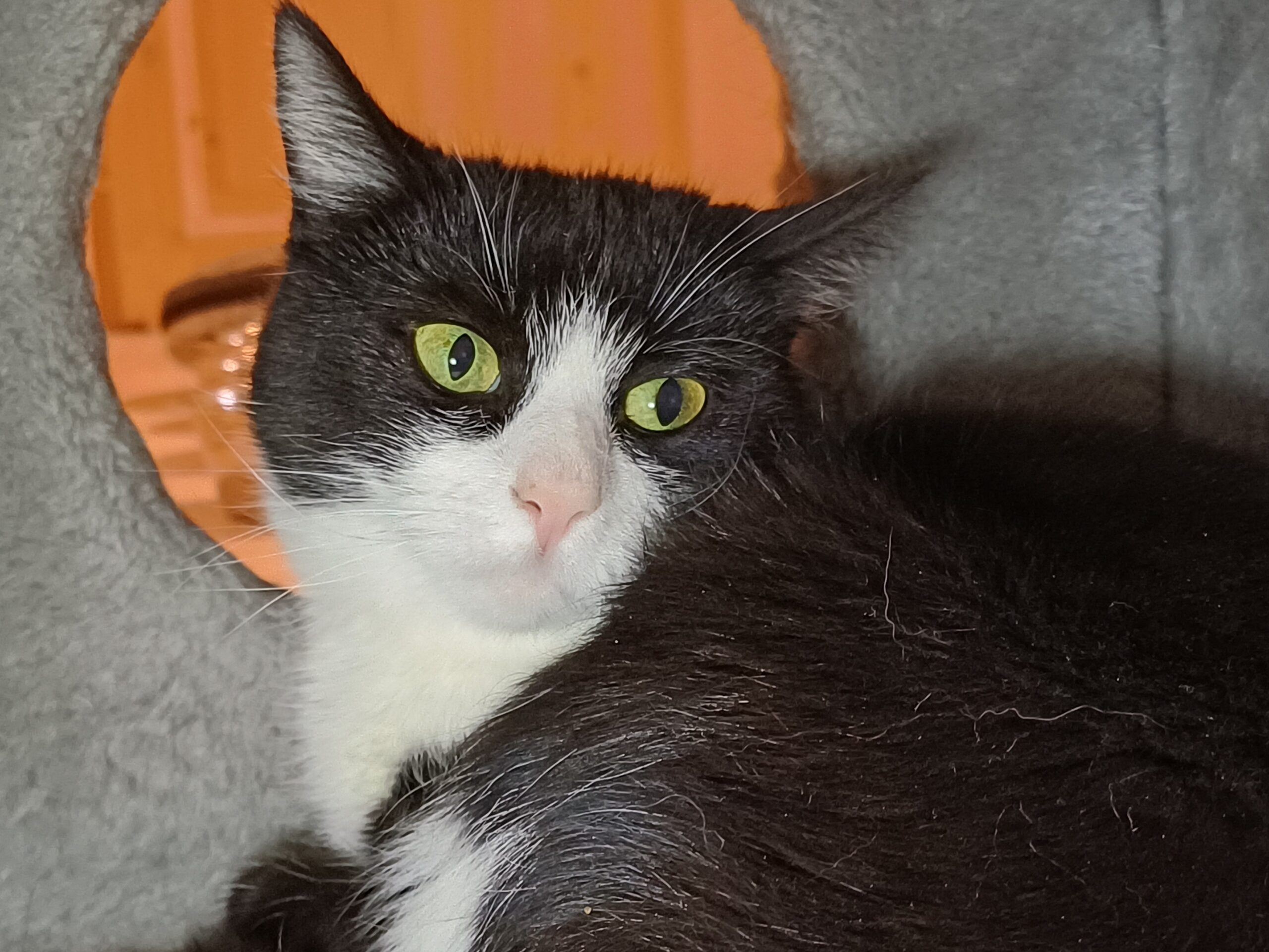 Skygg tjej som kom till oss med flera andra från en kattkoloni. Hon tycker det är lite läskigt att låta människor komma henne nära, men hon gör lite framsteg på katthemmet och känner sig tryggare med tiden, så med lite tid och tålamod kommer hon nog bli ett gott sällskap.