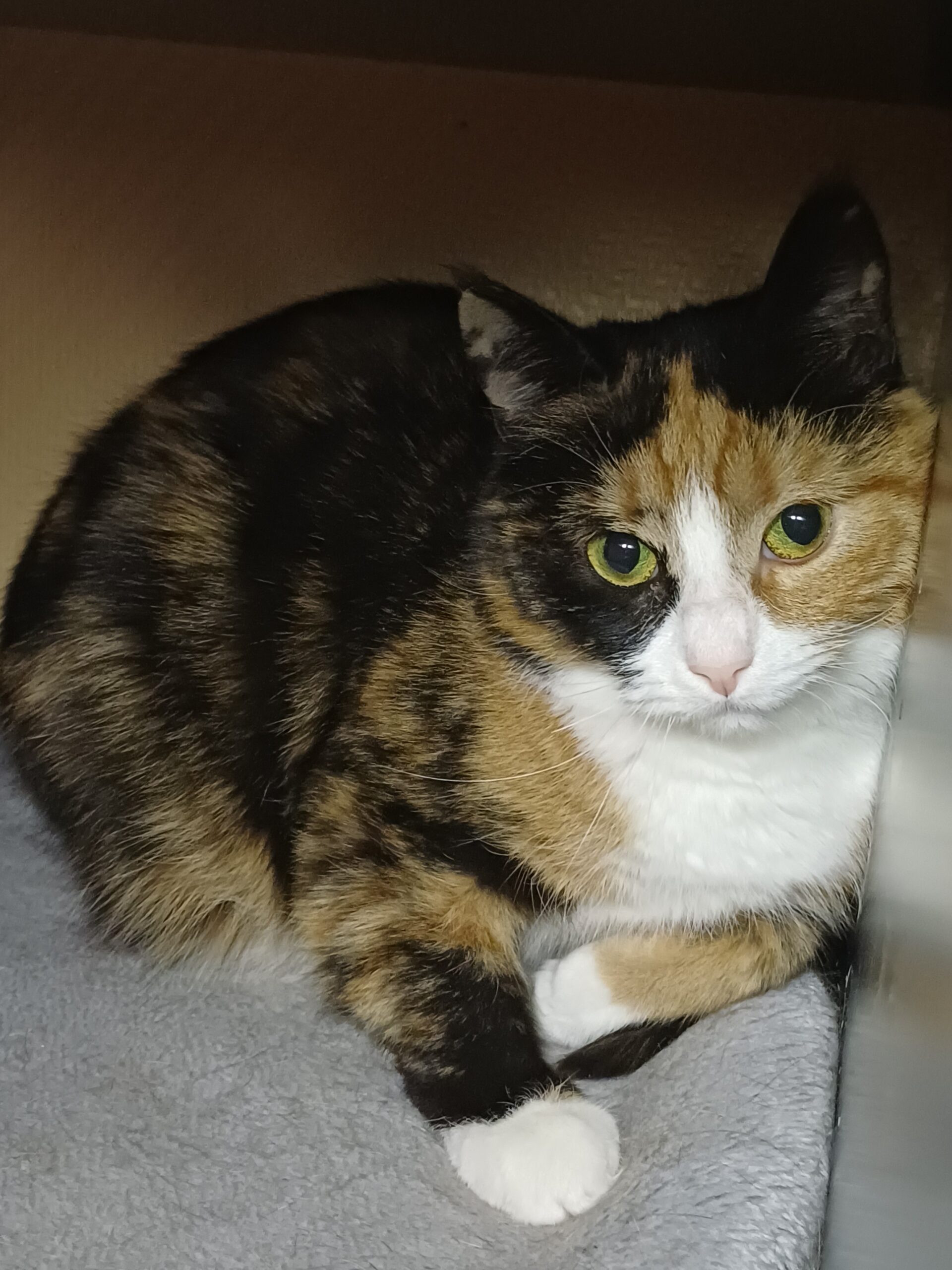 En lugn men lite skygg katt som kommer från en kattkoloni, hon är inte helt trygg i att bli klappad än men ligger kvar om man kommer nära. Bruttan längtar till sitt nya hem och hon funkar bra med andra katter.