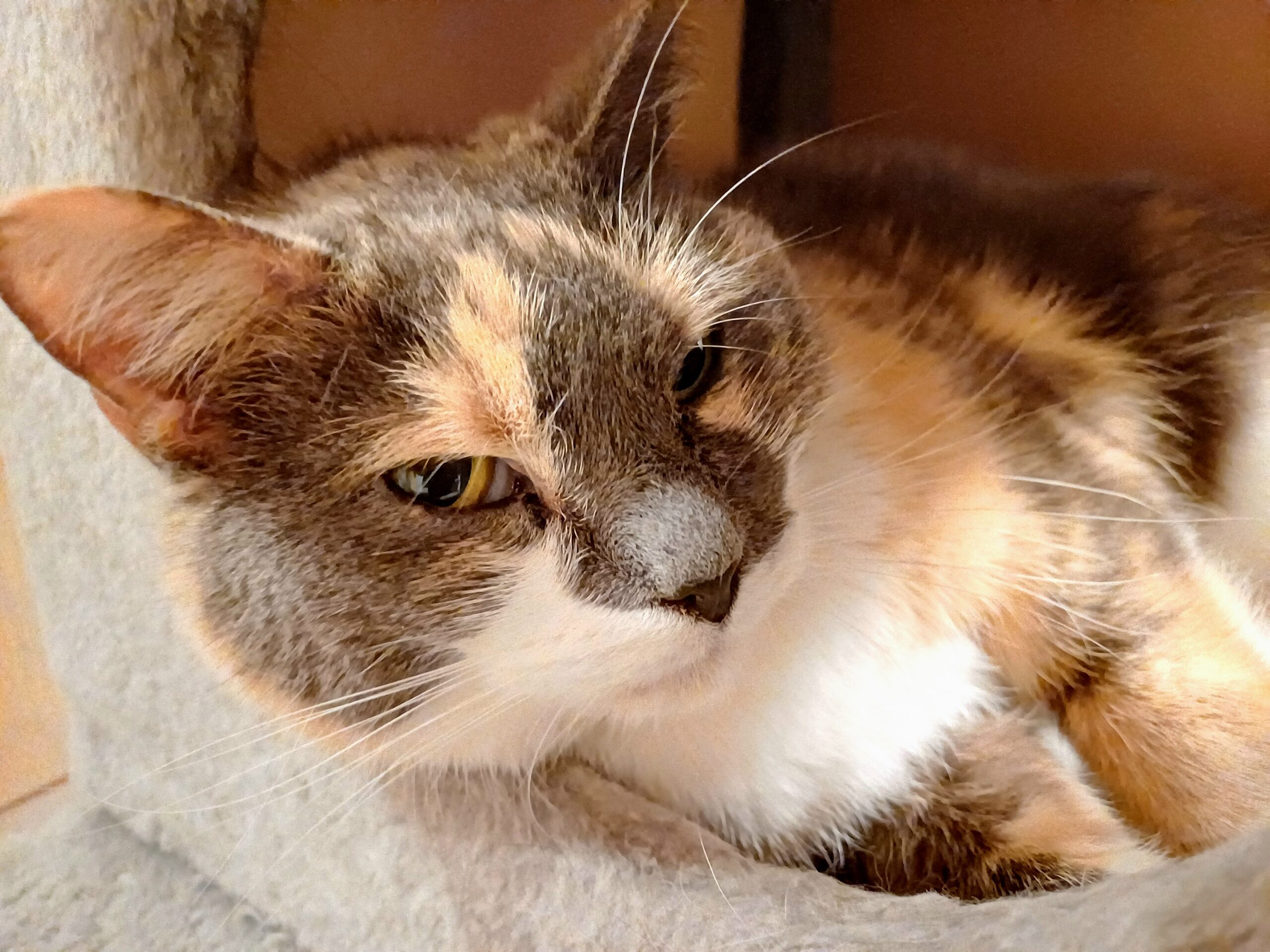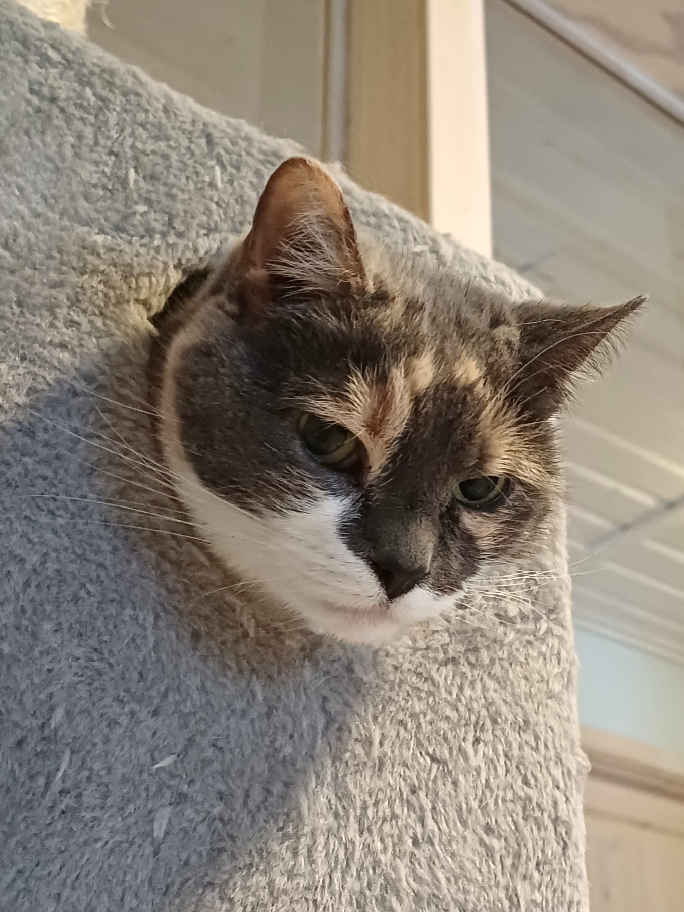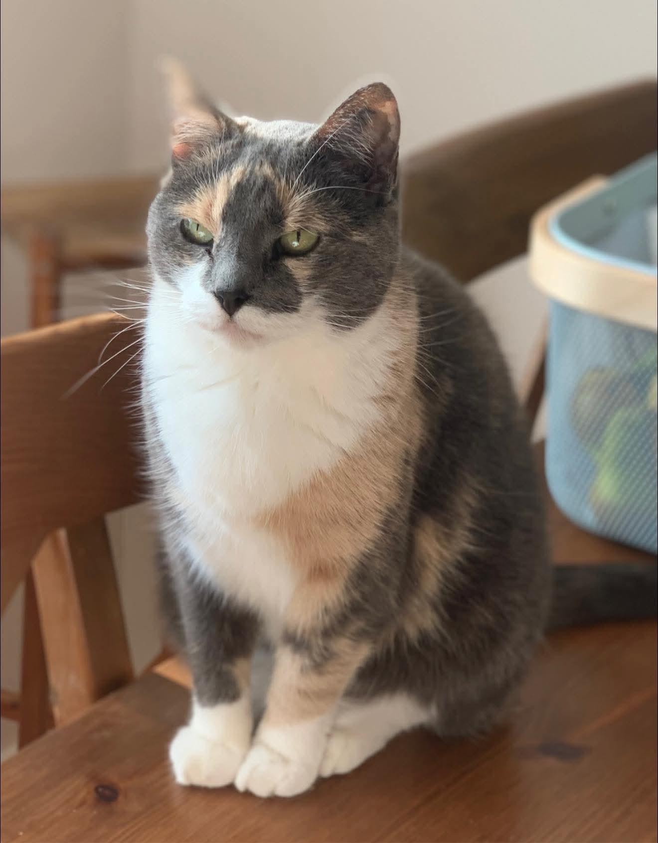 Juni söker ett nytt kärleksfullt hem, hon är just nu en lugn och gosig tjej som känner sig tryggast i sin koja. Hon önskar sig ett lugnt hem som innekatt utan småbarn och hundar, men är van att bo med katt.