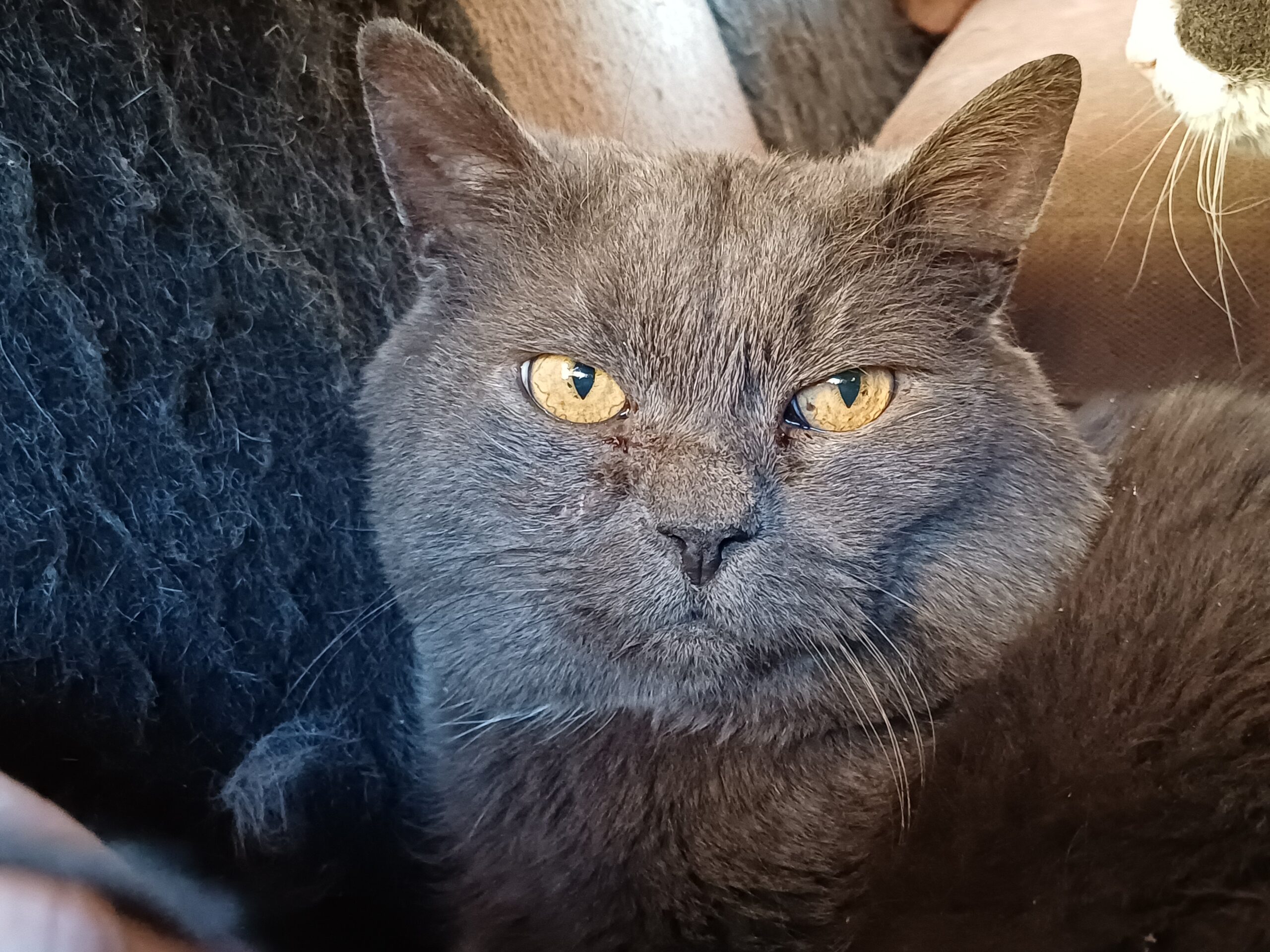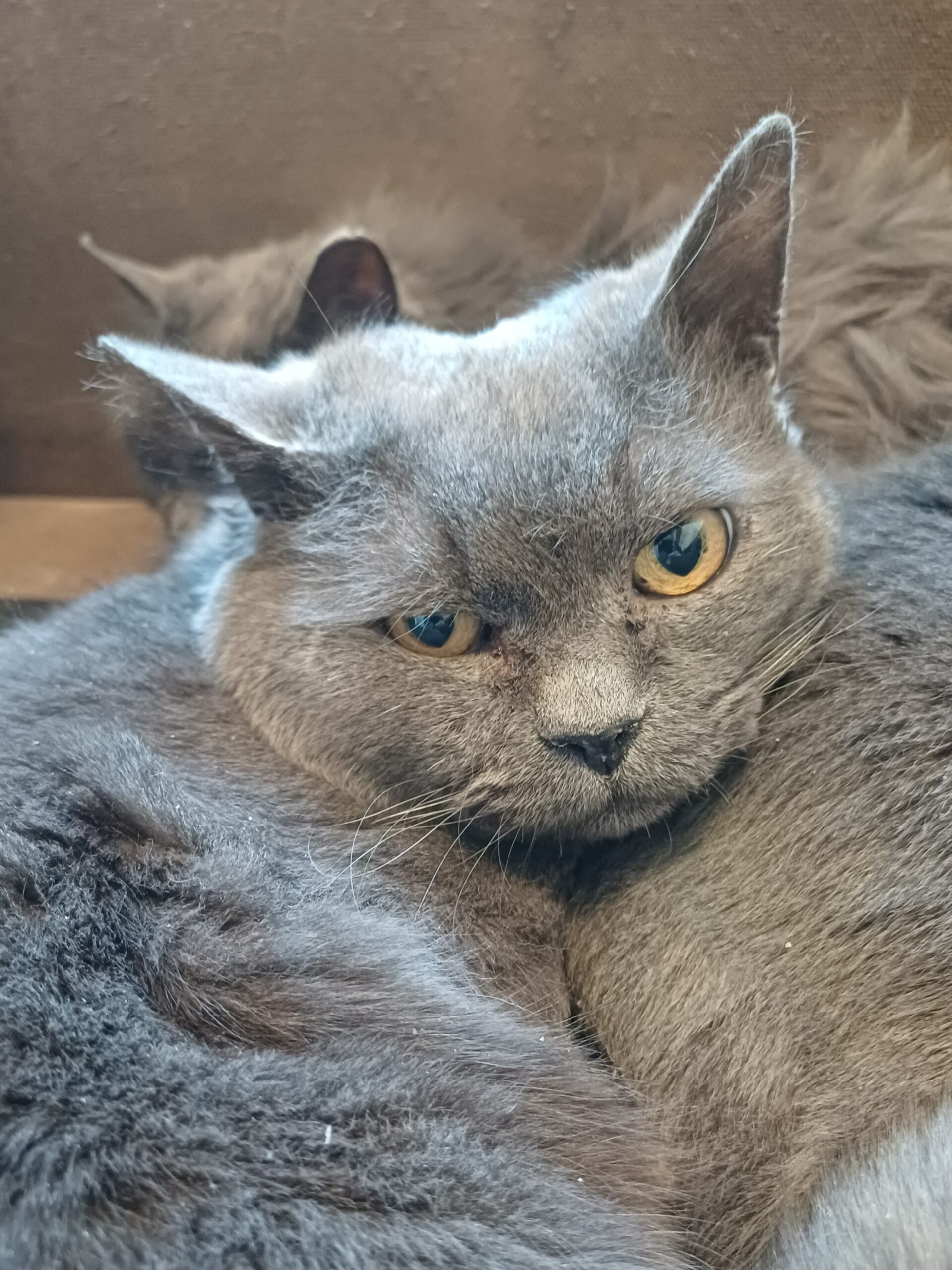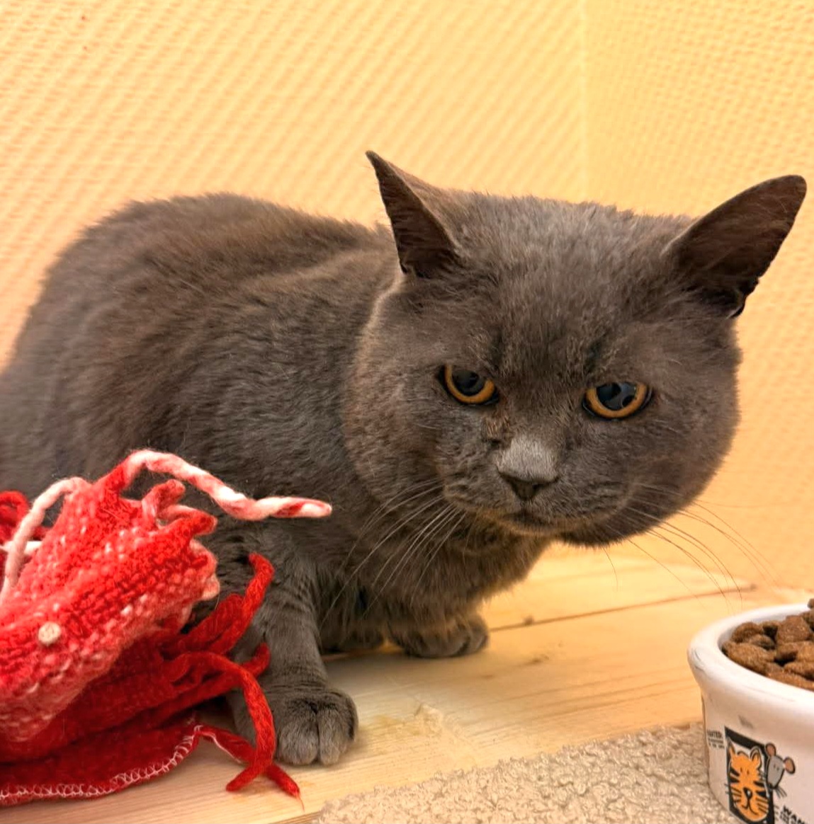 Mille kom till oss med flera andra katter som hade oturen att tappa sitt hem pga brand. Han är en snäll herre, men är fortfarande lite försiktig och osäker i sin nya miljlö, han söker nu ett nytt kärleksfullt hem som kan ge han lite tålamod och trygghet.