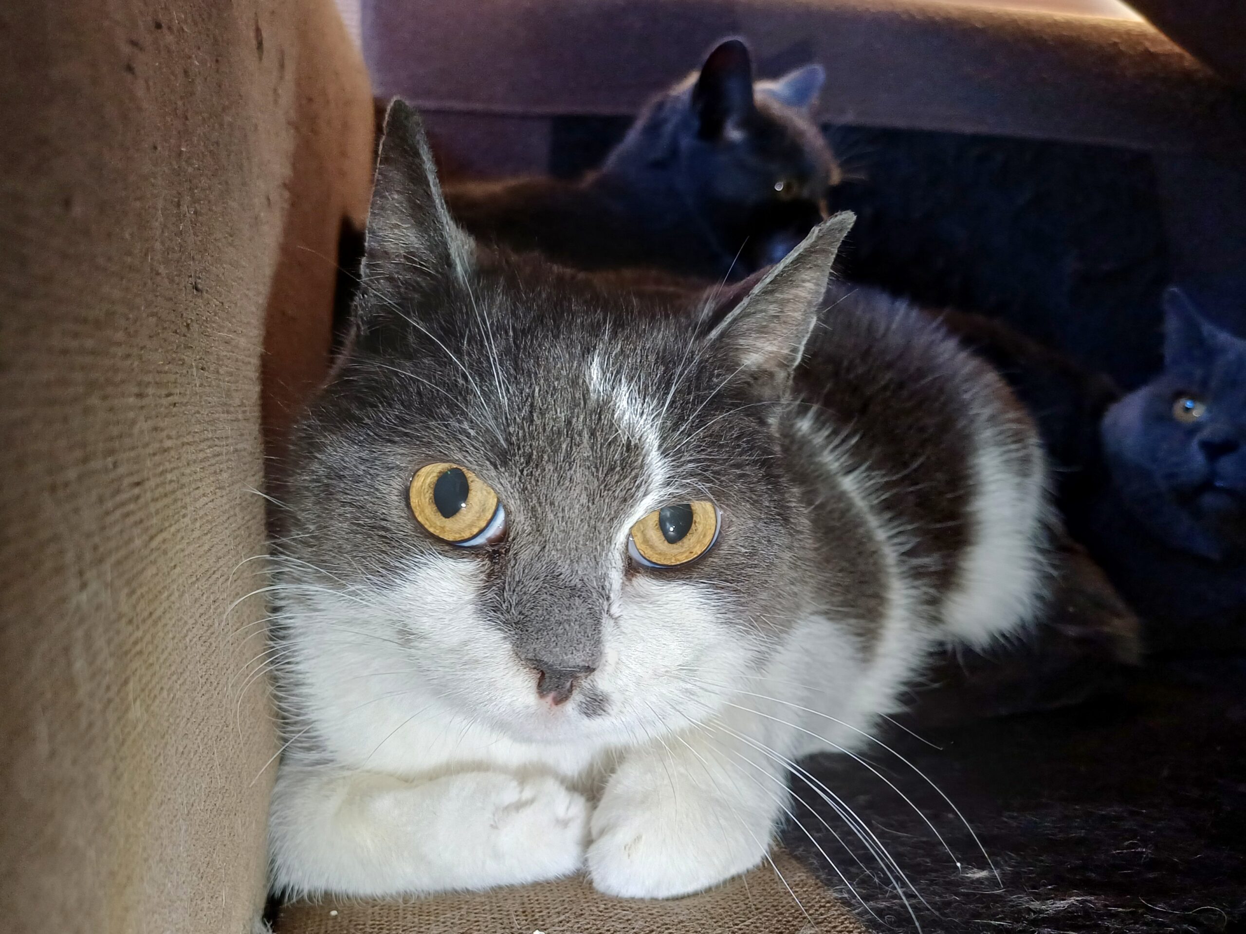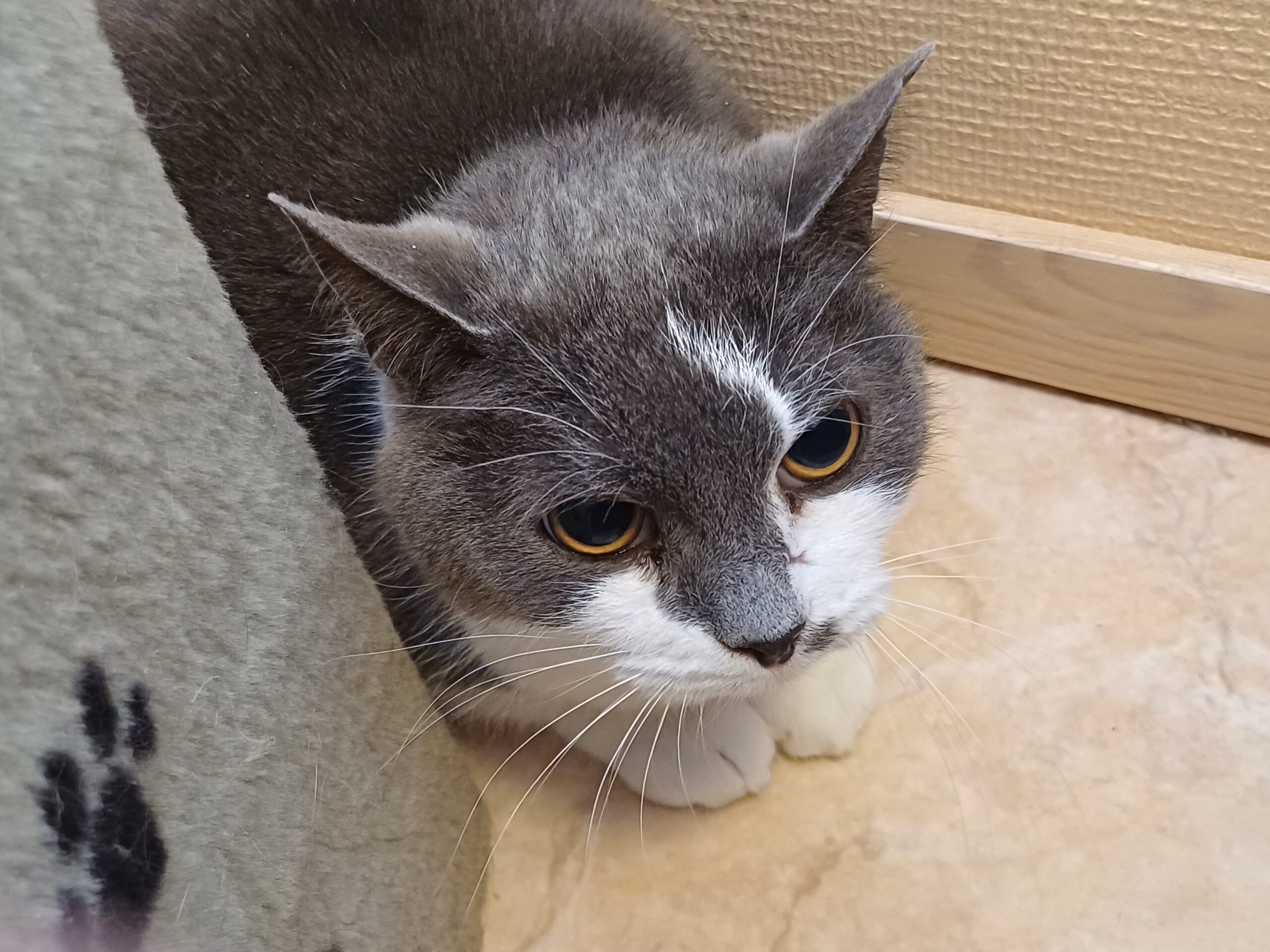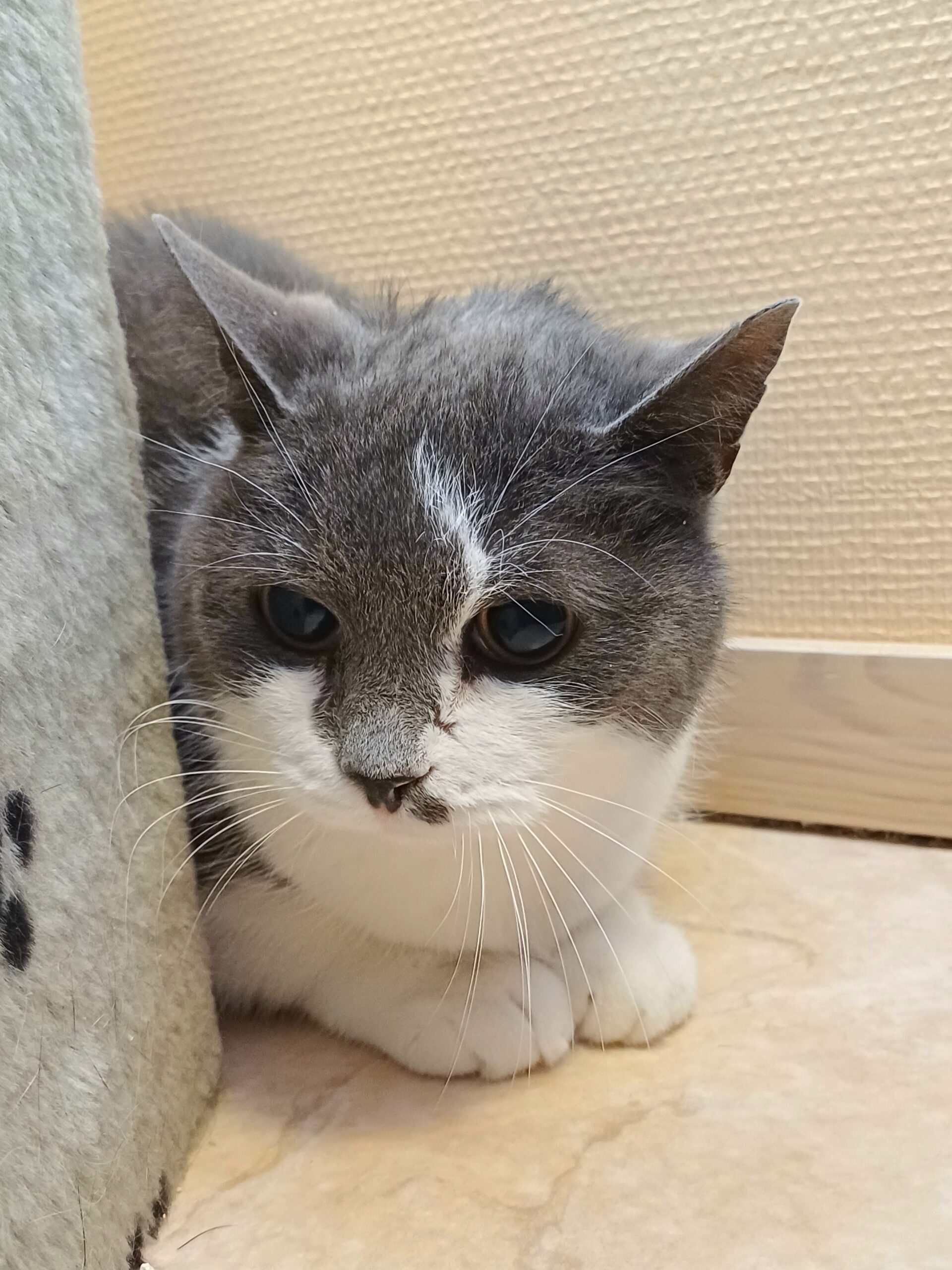 Mowgli är en snäll kille som är försiktig genom lägga upp en liten fasad med att morra och fräsa, men ändå så gillar han när man gosar o kliar han bakom örat,nså det beror nog bara på miljöombytet. Han är en av de katterna som tappat sitt hem pga brand, därför söker han nu ett nytt hem att könna sig trygg i.