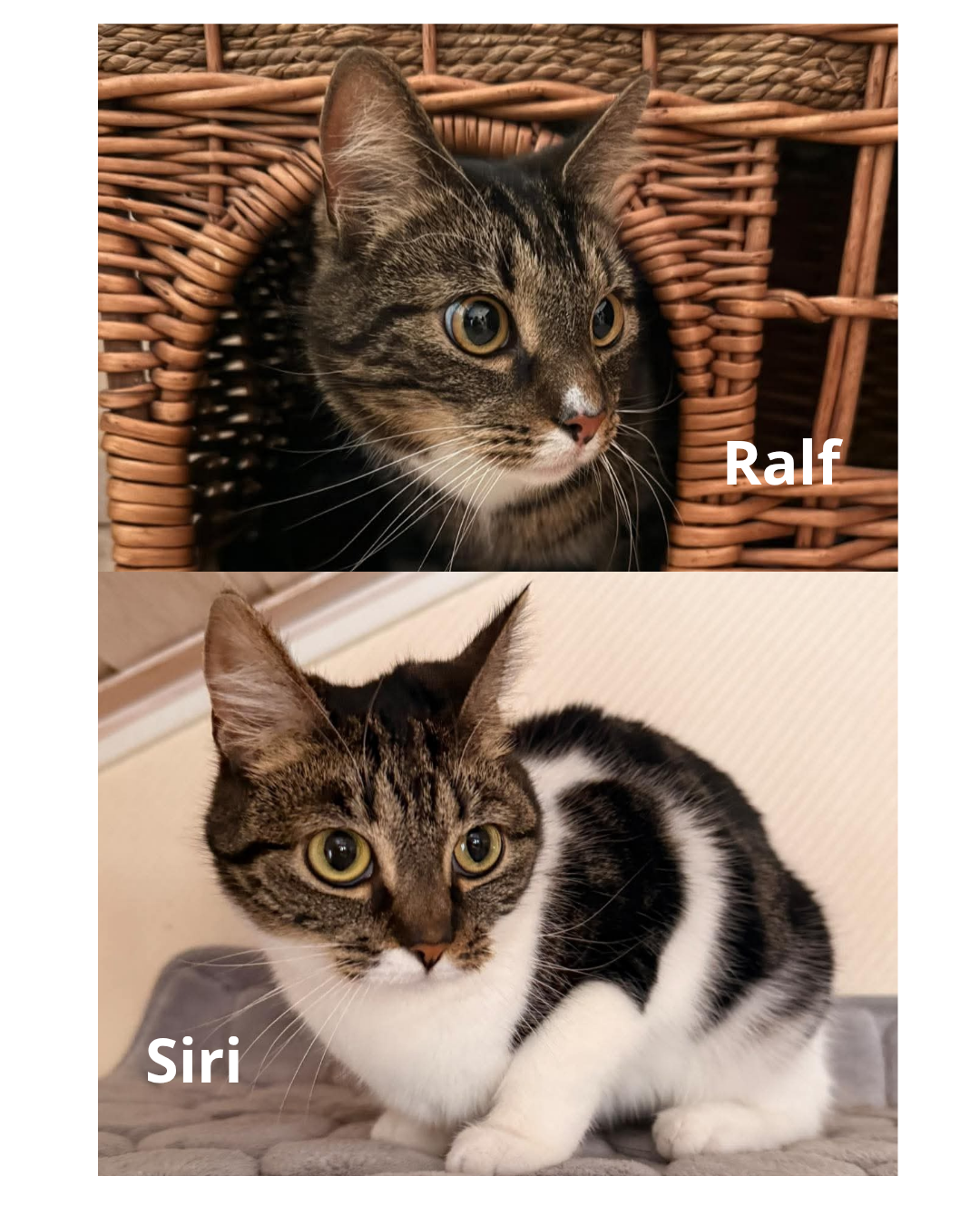Ralf och Siri är två kullsyskon med härliga personligheter. Ralf är en nyfiken kille med hög energi som älskar att vara med överallt. Siri är en mysig och social ung dam som inte tackar nej till lite gos.