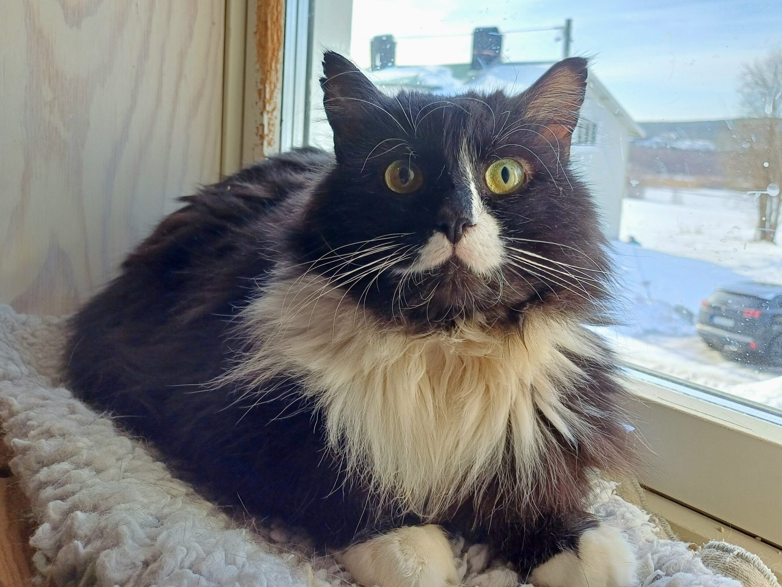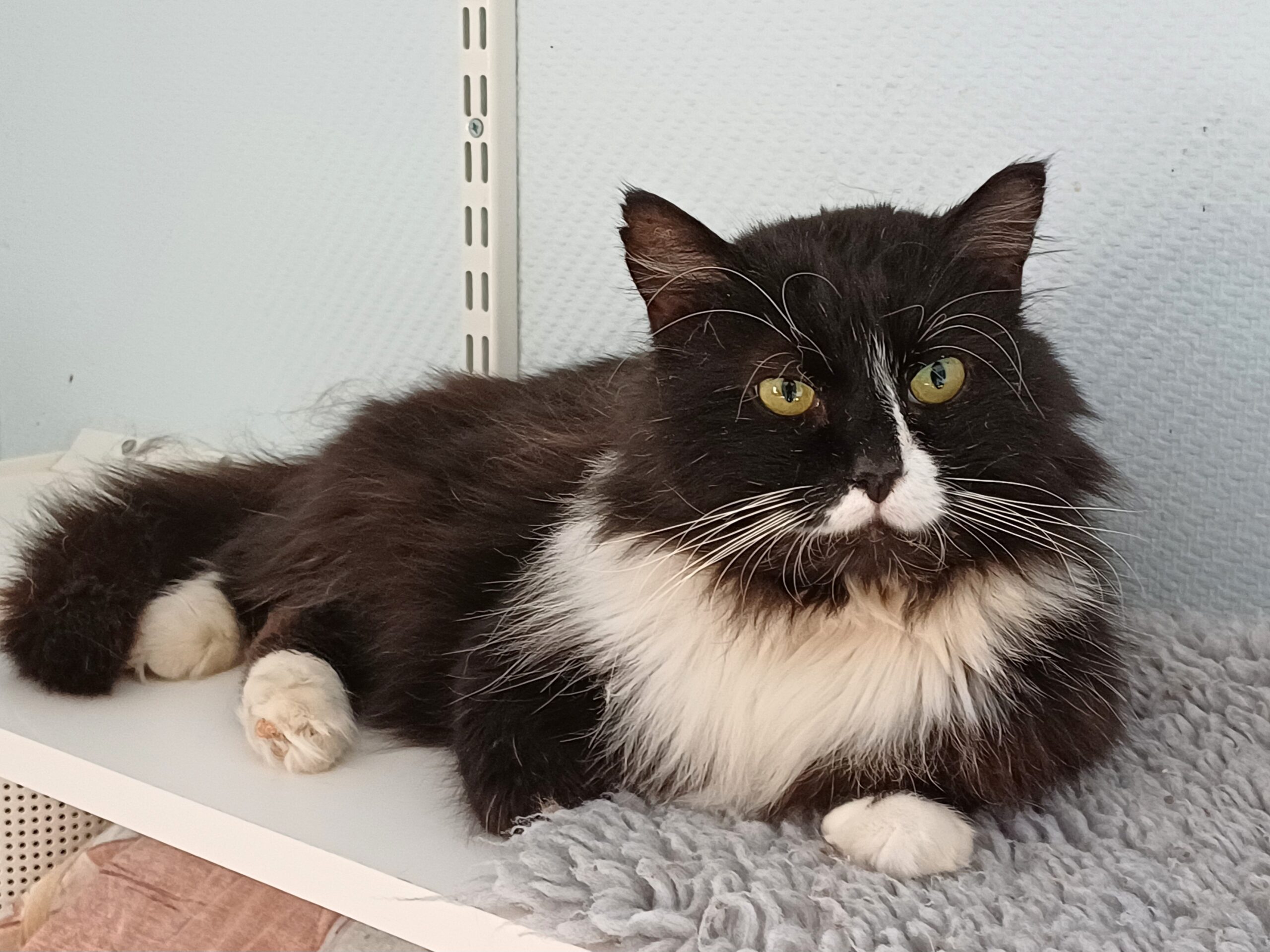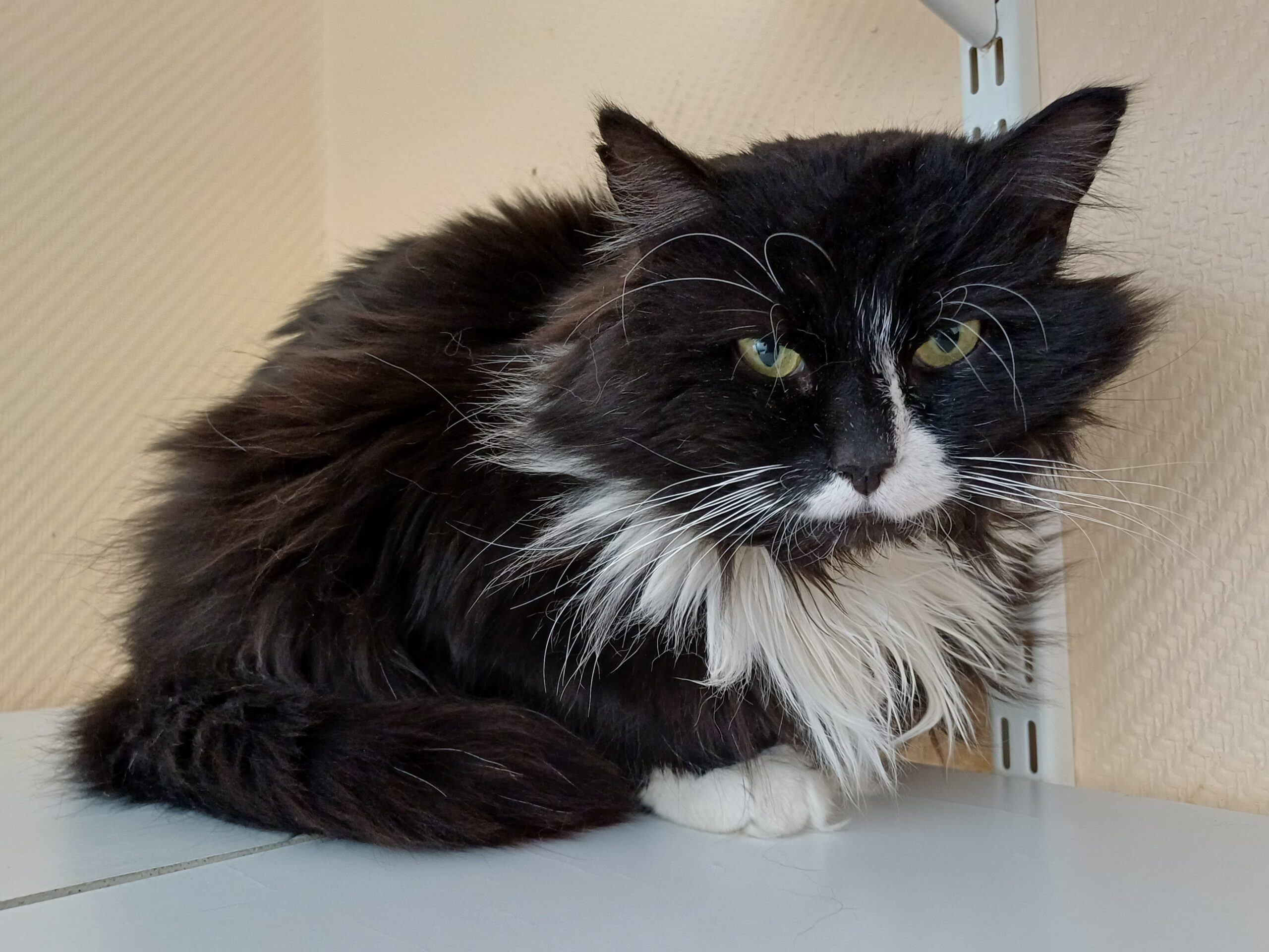 Här har vi en väldigt fluffig och go kille som söker ett nytt kärleksfullt hem. Han har tjock päls så man får hålla koll på tovorna som med alla långhåriga katter. Han trivs bra med att ligga och njuta i fönstret eller i ens knä.