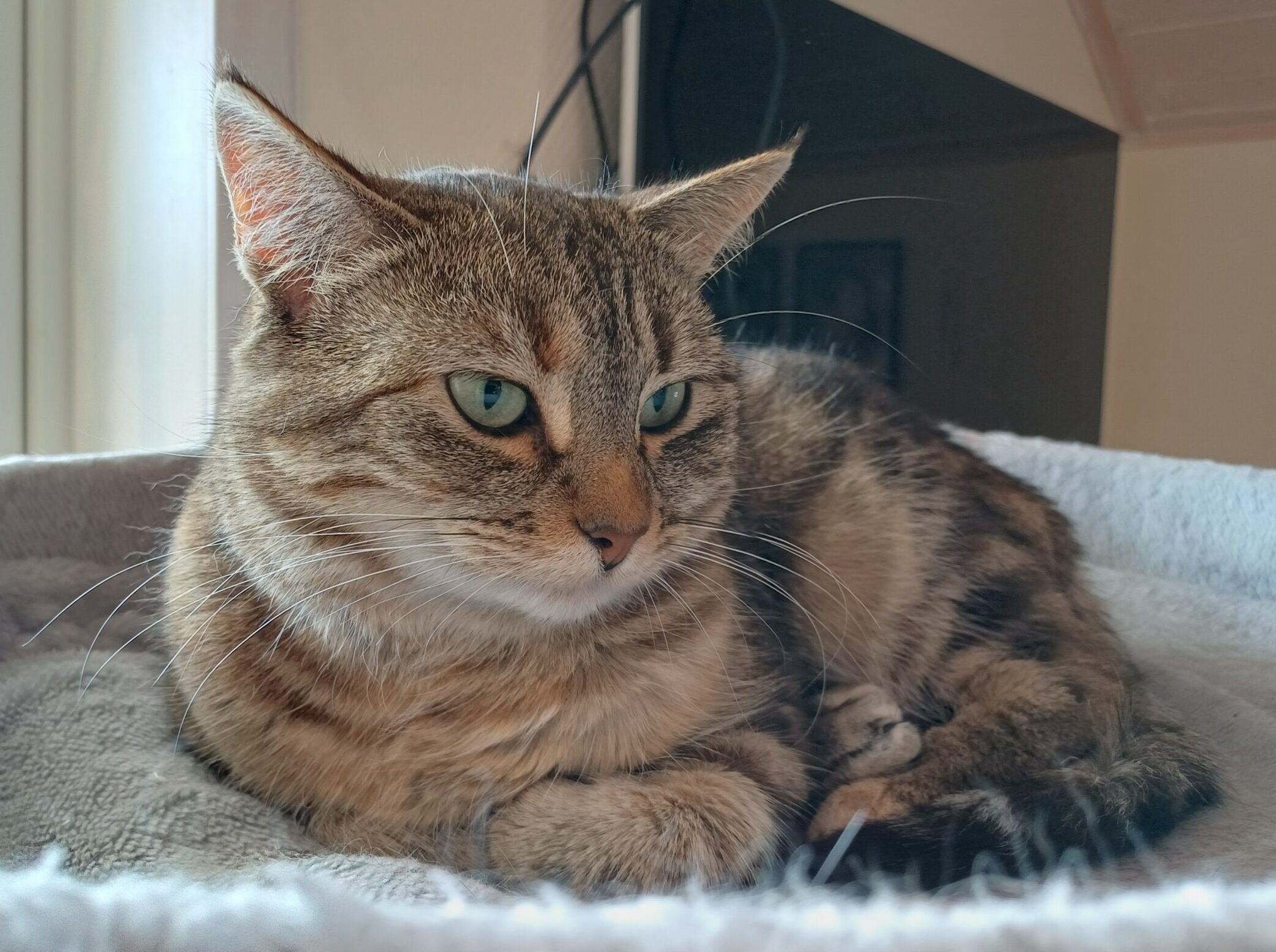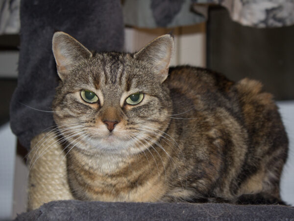Är född och uppvuxen i vilt tillstånd. En lugn och mysig katt som gillar godis och vila i soffan eller i ett katträd.